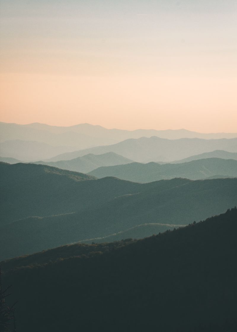 As silhuetas suaves das montanhas se sucedem em camadas infinitas, como ondas de serenidade no horizonte.