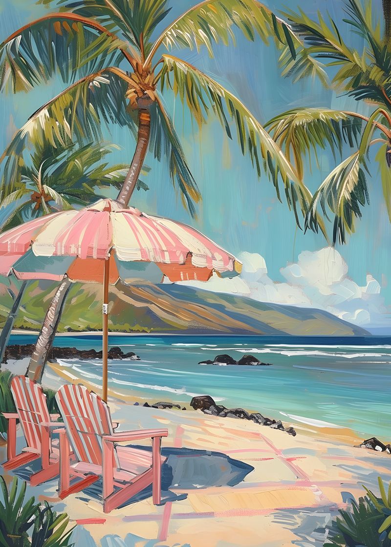 Cadeiras coloridas, coqueiros e o mar ao fundo. Uma cena que convida ao descanso e à contemplação.