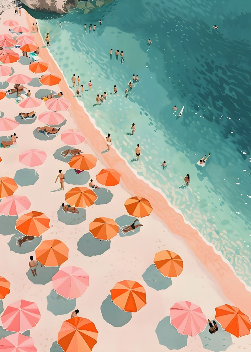 Um mergulho no azul cristalino e o calor suave da areia — a cena perfeita para relaxar sob os tons vibrantes dos guarda-sóis.