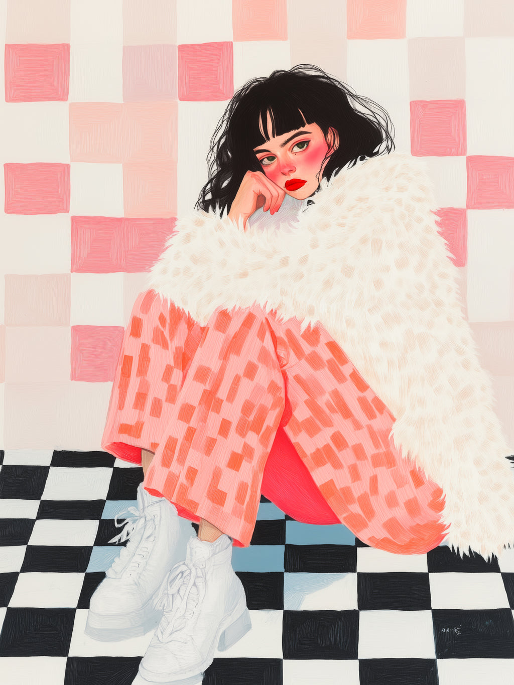 Jovem de olhar intenso senta-se sobre piso quadriculado, vestida em padrões rosados e casaco branco. A cena mistura moda, atitude e contemplação.