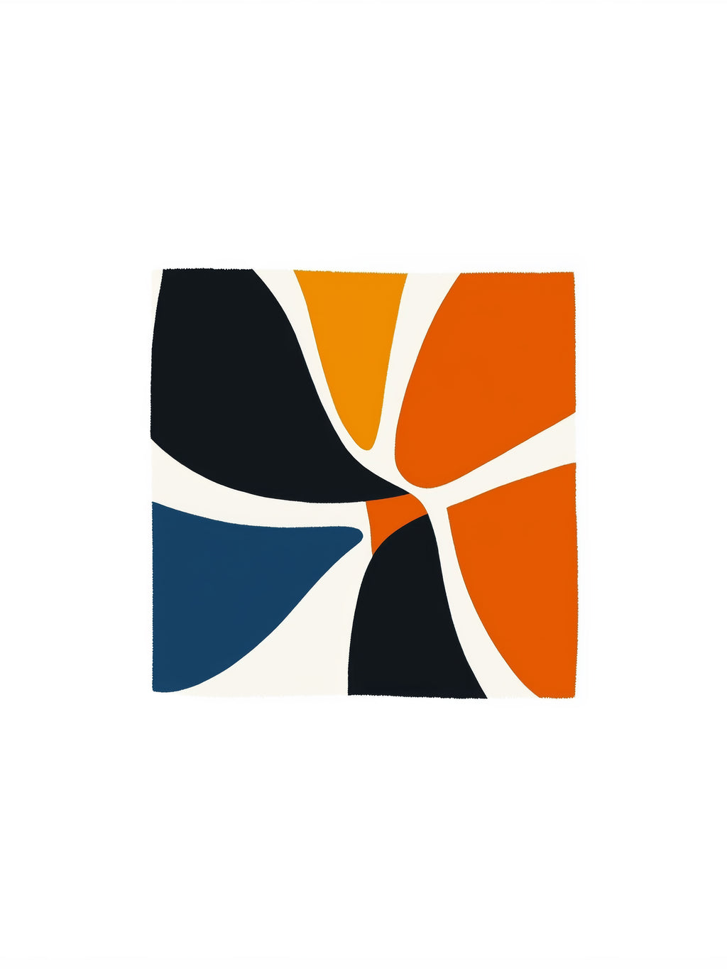 Formas orgânicas em preto, azul, laranja e vermelho se unem como pétalas de uma flor geométrica. Uma obra vibrante que transmite vitalidade e movimento.