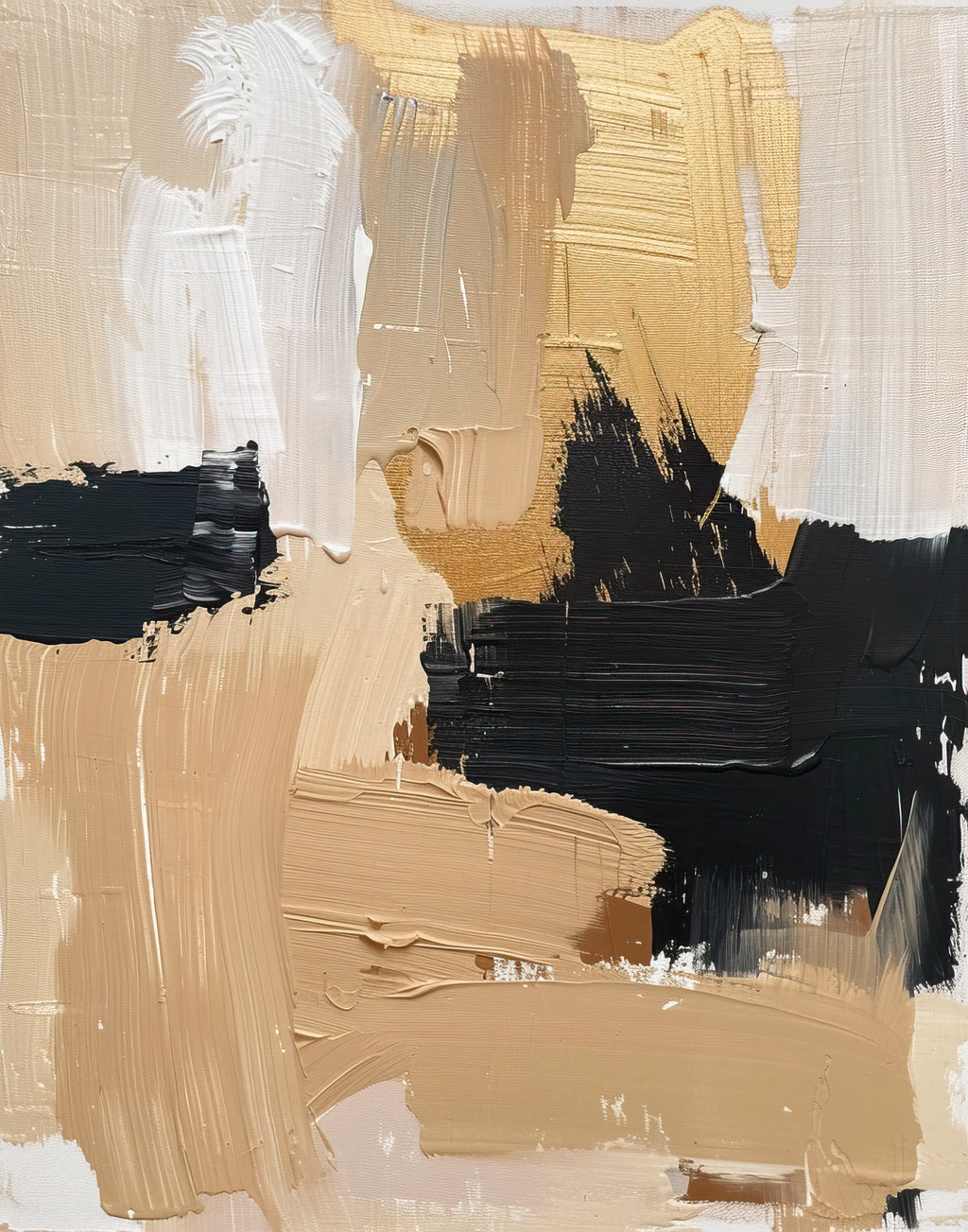 Grandes gestos de tinta em tons de areia, dourado e preto criam um contraste vibrante e expressivo. A obra carrega um tom quente, ideal para aquecer e dar personalidade a salas e escritórios.