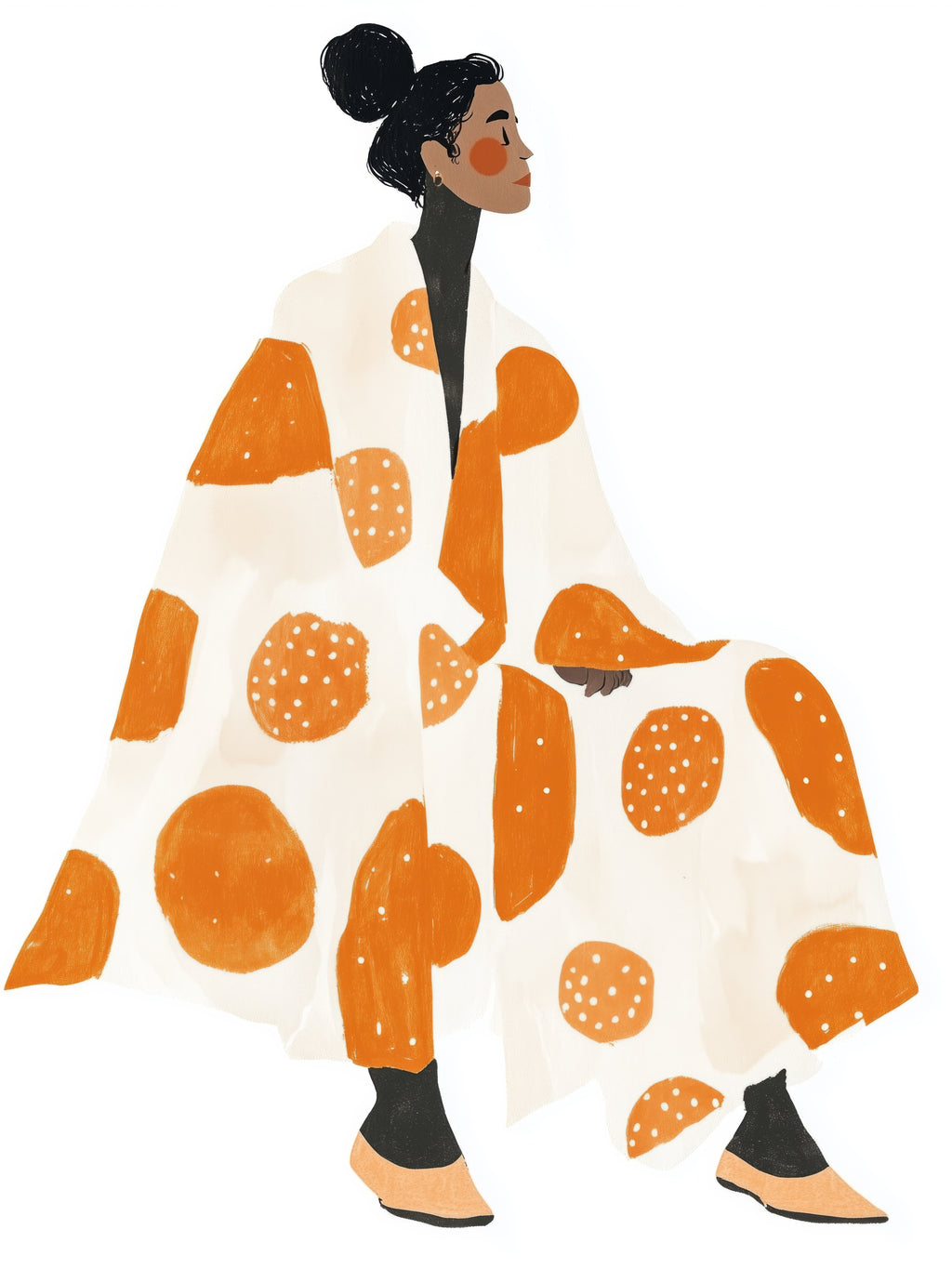 Silhueta elegante envolta por um manto branco salpicado de grandes círculos laranja. A composição minimal cria movimento e bom humor sem ruído. É cor que aquece e afirma personalidade — um raio de sol permanente na parede.
