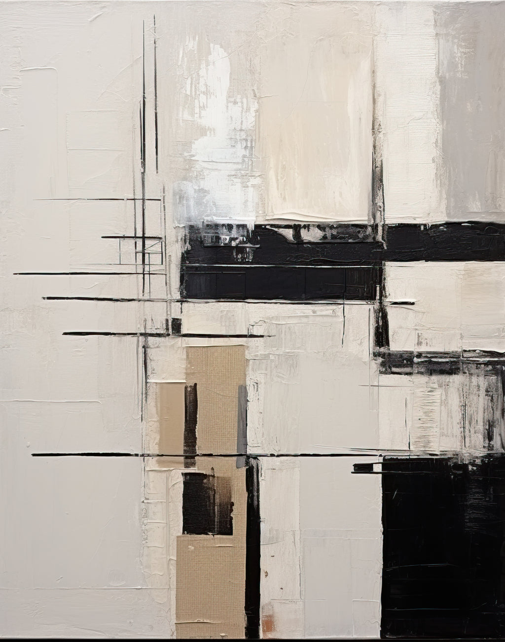 Blocos grossos de preto, bege e branco criam uma cruz central de impacto. A textura forte traz densidade e rusticidade, como se fosse uma parede antiga revelando suas camadas. É arte bruta, moderna e marcante.