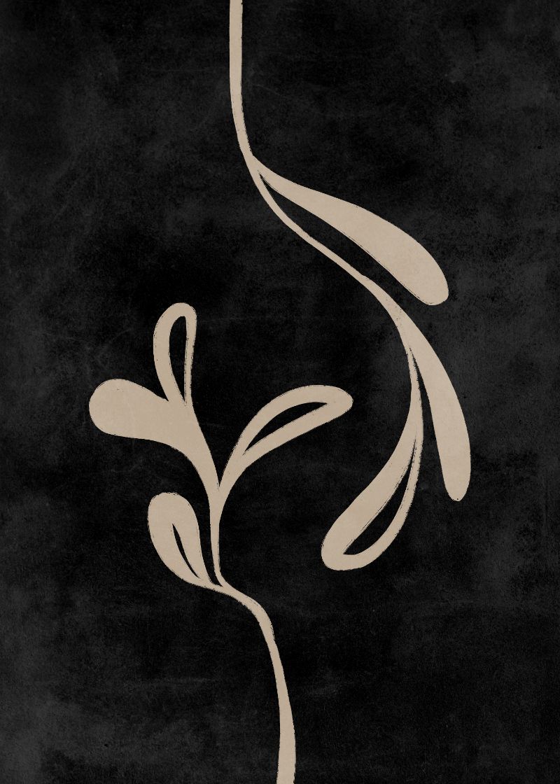 Traços delicados que brotam de um fundo profundo, como vida em contraste.