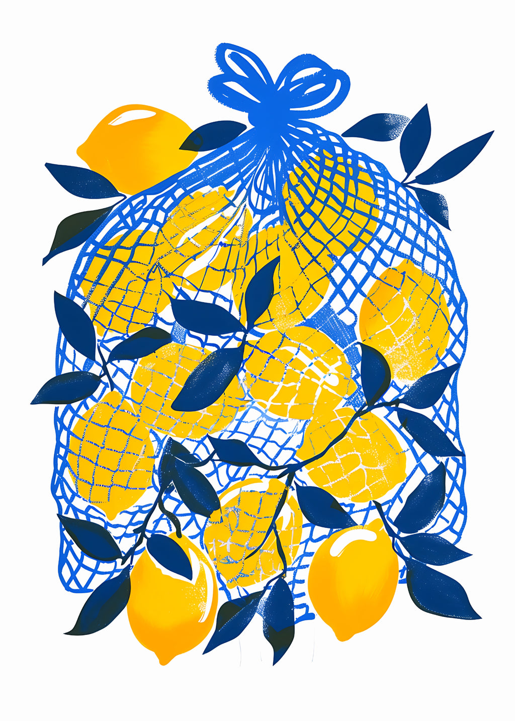 Limões vibrantes em tom amarelo repousam dentro de uma rede azul intensa, acompanhados por folhas estilizadas. A composição é pop, gráfica e cheia de personalidade.