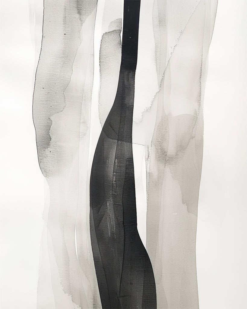 Camadas translúcidas em tons de cinza se sobrepõem como véus, formando um fluxo vertical que remete a água em movimento ou fumaça etérea. Minimalista e fluido, traz uma sensação de leveza e contemplação.