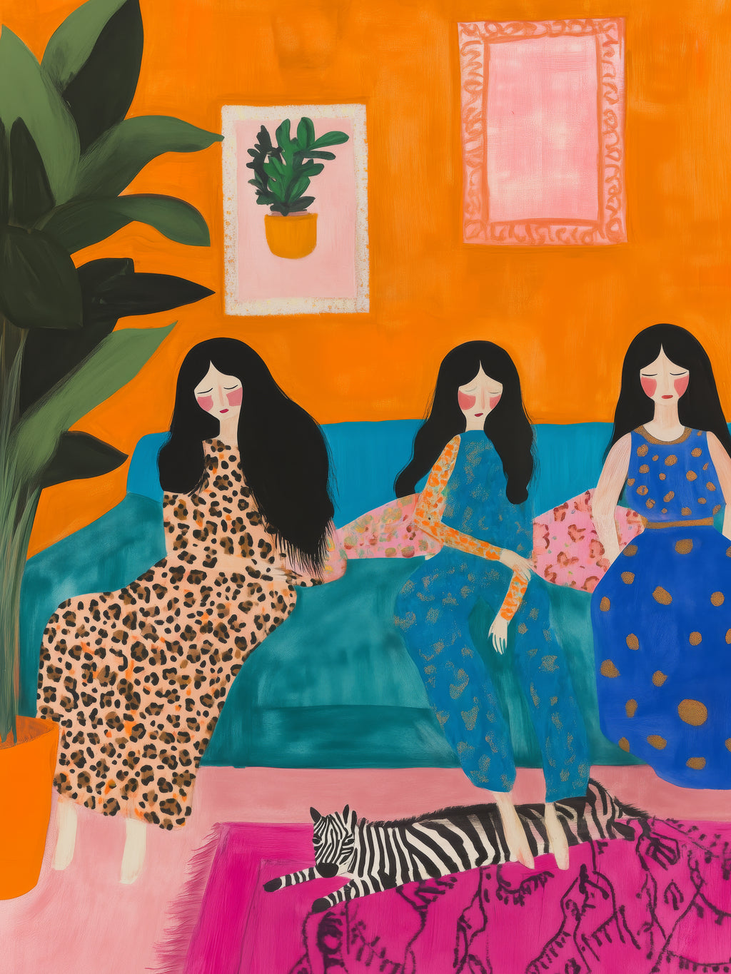 Três mulheres de longos cabelos negros, sentadas em um sofá azul, cercadas por cores quentes e detalhes que contam histórias — um vaso, quadros, um tapete rosa e até um gato listrado repousando no chão. “Sala de Histórias” transmite a beleza dos momentos compartilhados, do aconchego e da amizade silenciosa. Uma obra que aquece e humaniza qualquer espaço.