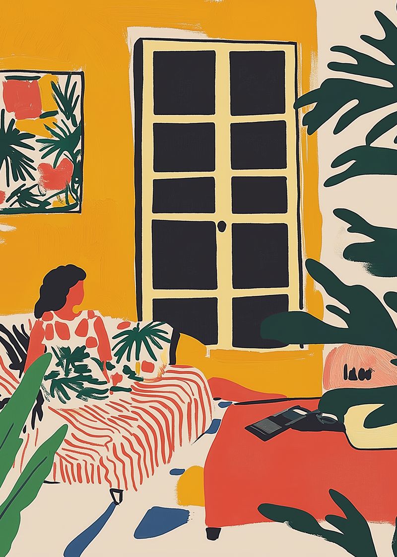 Uma sala moderna com fundo amarelo, plantas tropicais e uma figura relaxando no sofá. Arte minimalista e cheia de calor, perfeita para ambientes descontraídos.