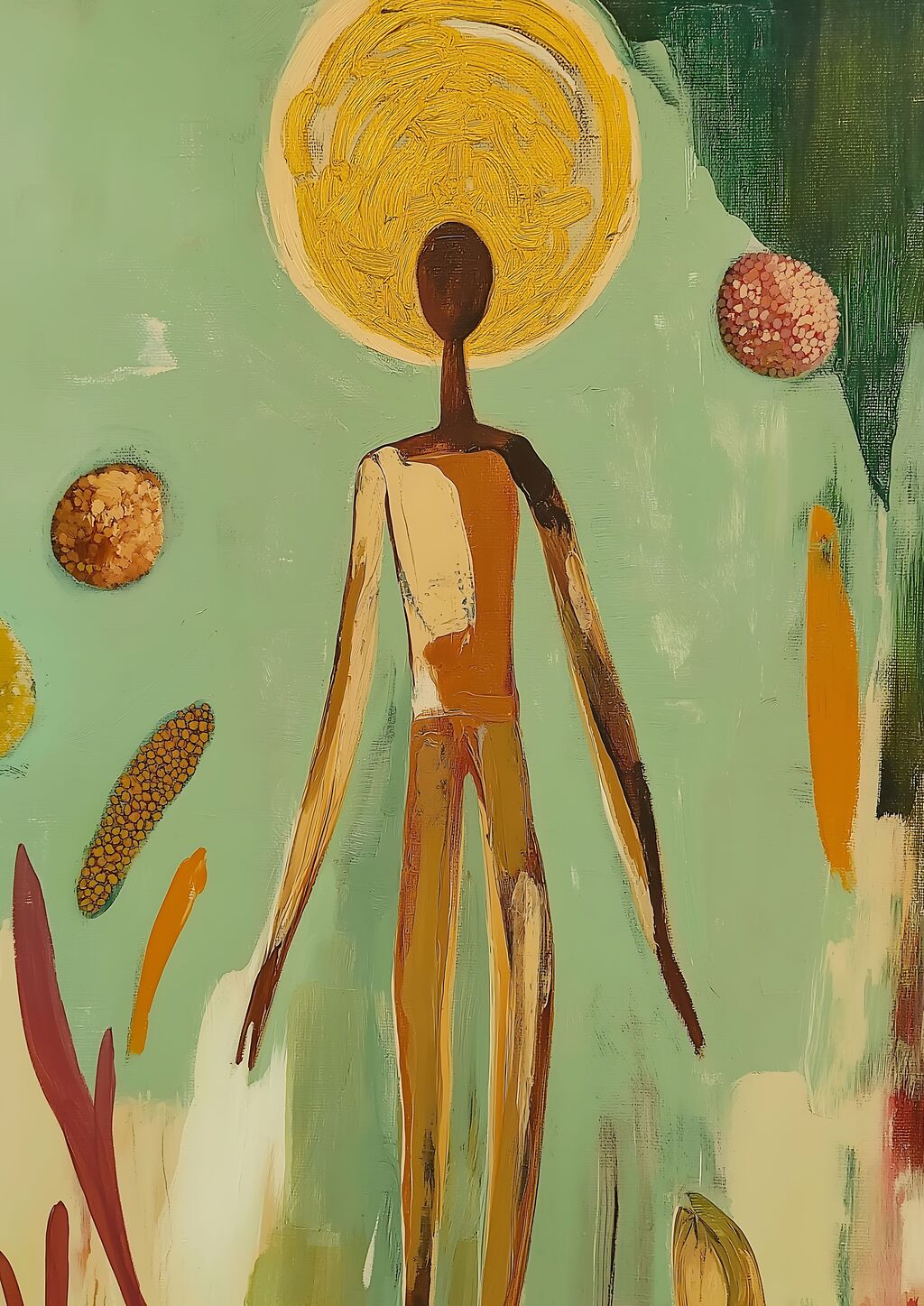 Figura feminina se inclina à claridade, irradiando vitalidade entre o humano e o divino.