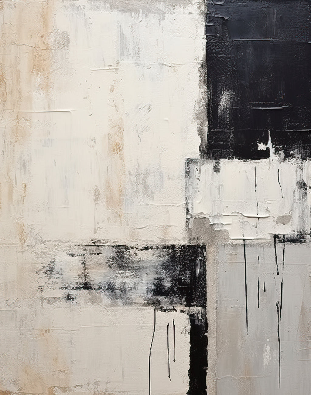 Texturas em blocos geométricos de preto, bege e dourado revelam a força do contraste entre solidez e fragilidade. “Silêncio Estrutural” traz a sensação de equilíbrio bruto, como se cada camada fosse construída sobre histórias não ditas. Ideal para ambientes modernos e sofisticados, que pedem imponência minimalista.