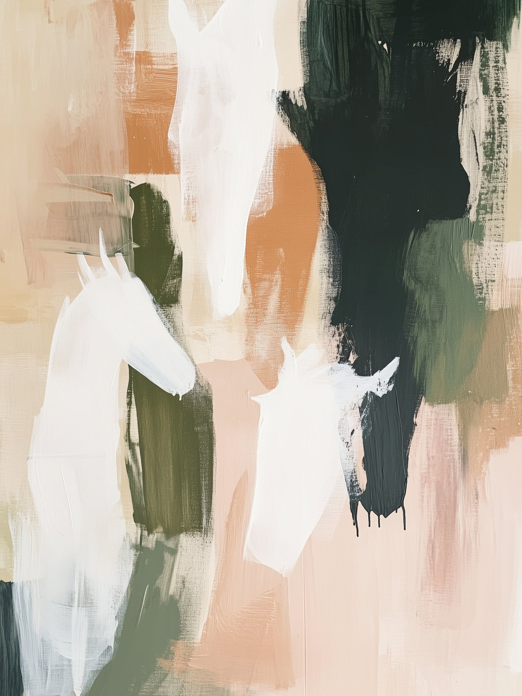 Manchas orgânicas em bege, branco, verde e preto revelam formas de cavalos, como aparições etéreas em meio ao abstrato. A obra transmite liberdade, dinamismo e uma beleza selvagem.