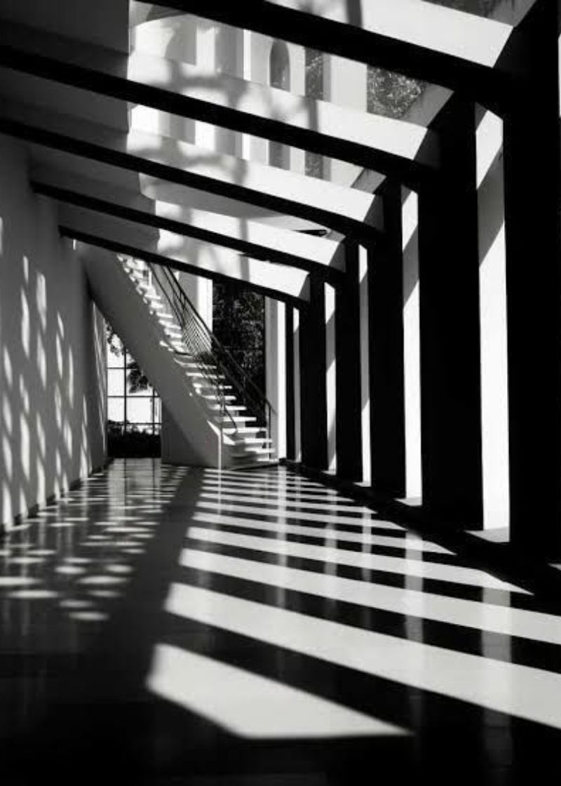 Um prédio minimalista em preto e branco, onde a luz e a sombra criam formas precisas e quase hipnóticas.