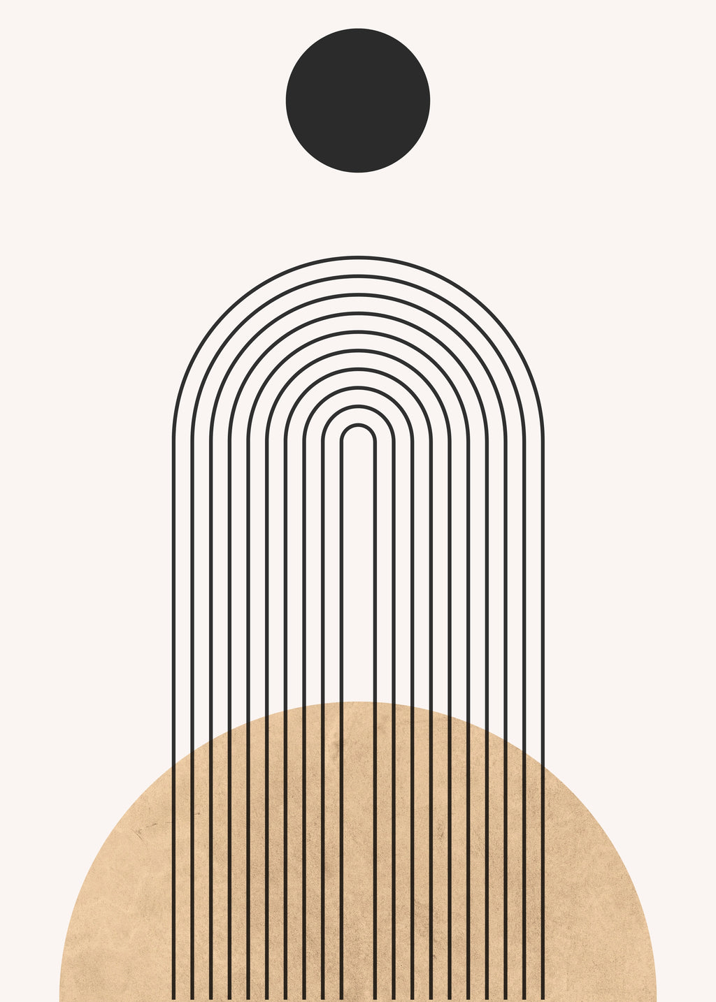 De um lado, o tom cru; do outro, o bege terroso. Entre ambos, linhas concêntricas em preto criam uma forma fluida, revelando o diálogo entre natureza e geometria.