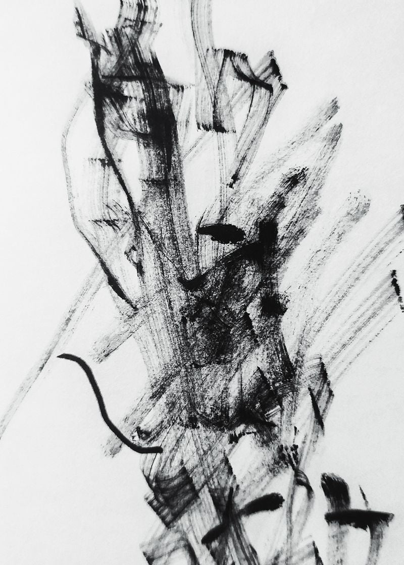 Pintura expressiva em preto sobre fundo branco, formada por pinceladas soltas e marcantes. A obra transmite energia e espontaneidade, lembrando gestos rápidos que registram movimento e emoção.