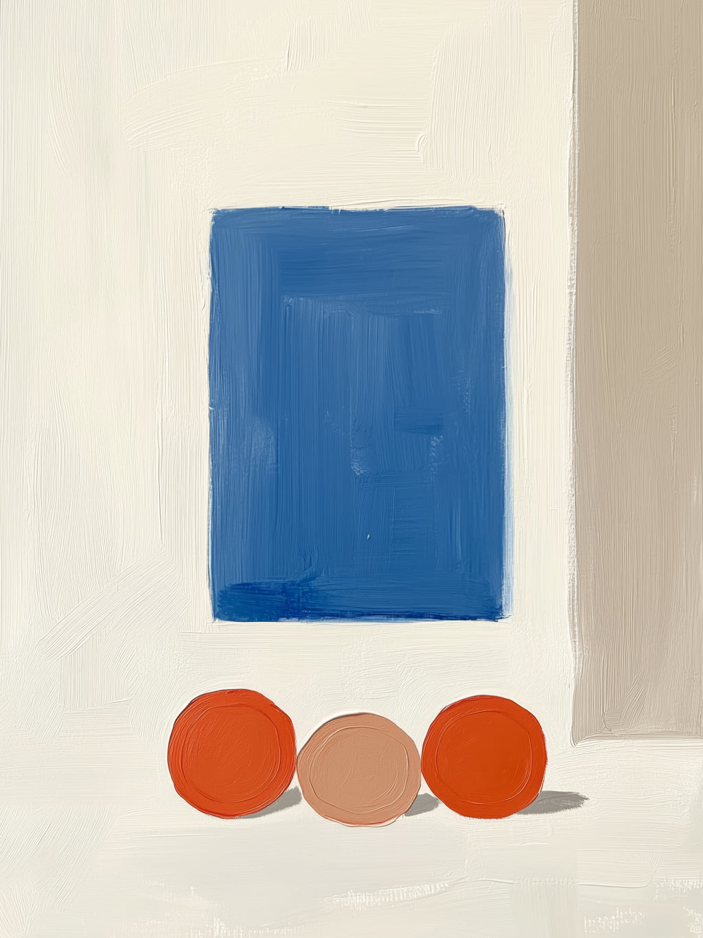Três esferas alaranjadas repousam diante de um retângulo azul sobre parede clara. A obra explora o contraste entre forma e vazio.