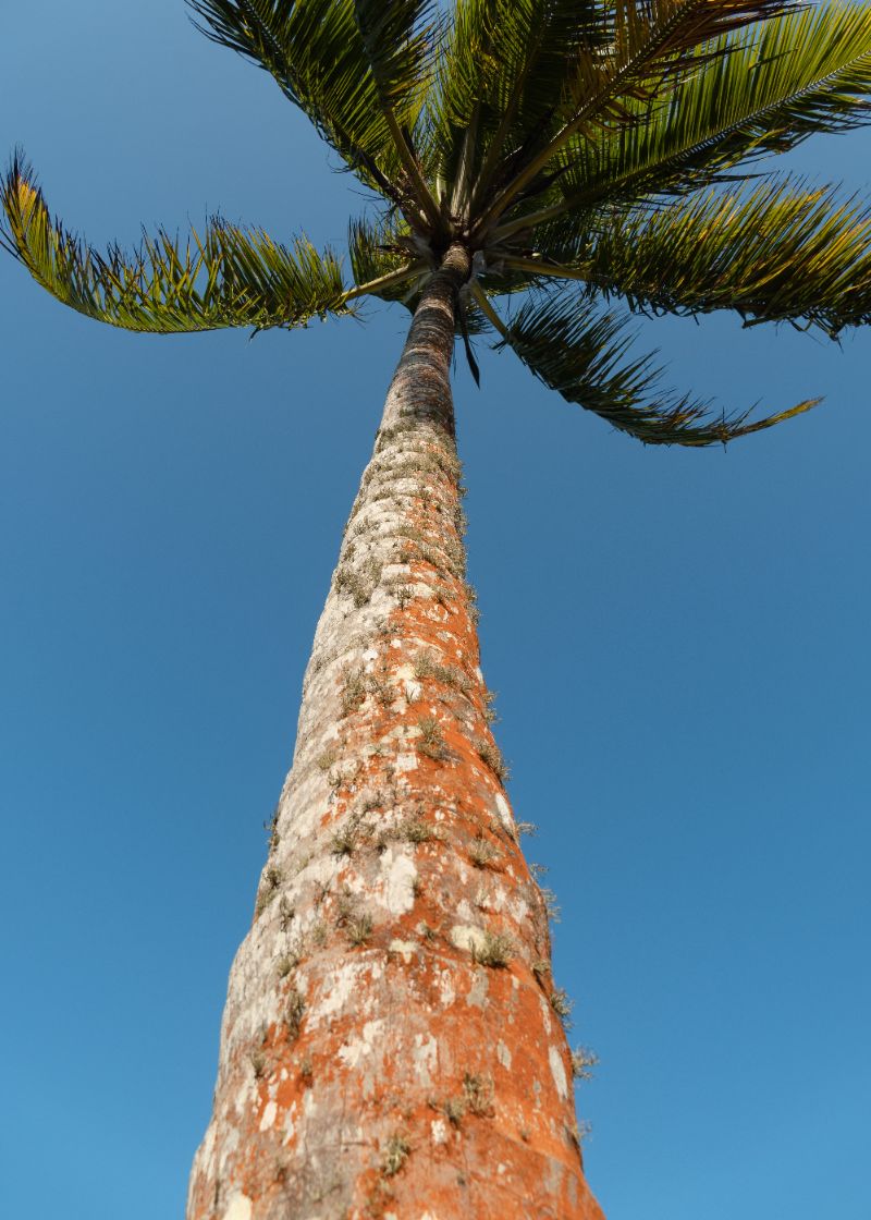 A textura avermelhada do tronco, marcada pelo tempo, em contraste com o azul do céu.
