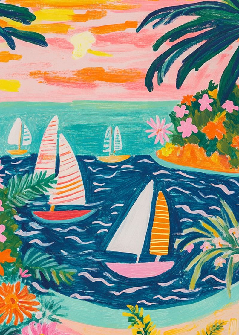 Um mar em movimento, veleiros coloridos e um pôr do sol vibrante celebram a liberdade e a alegria de viver.