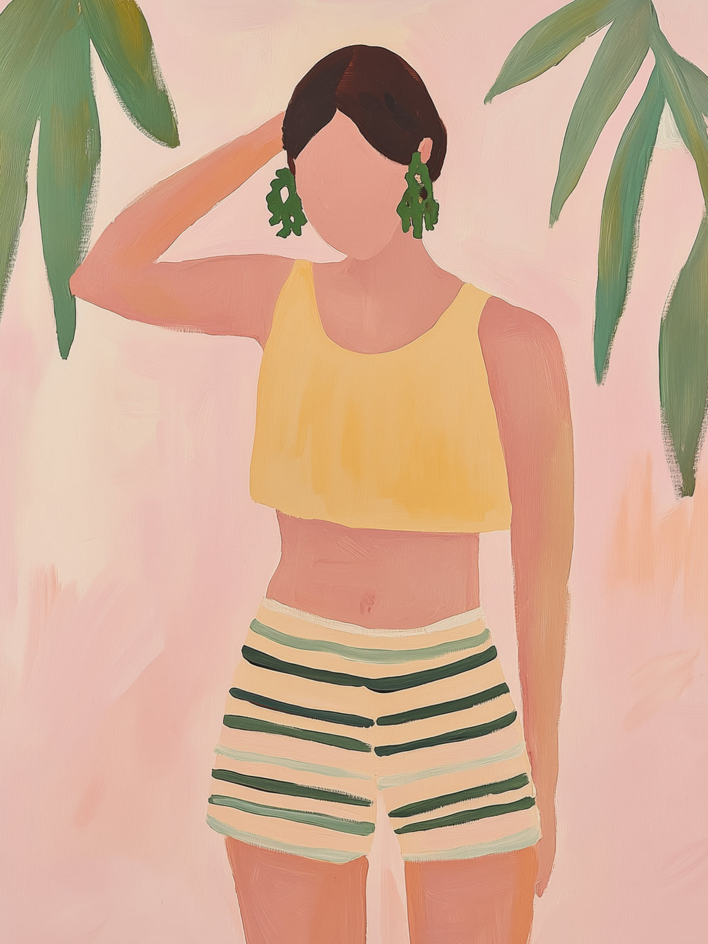 Mulher de top amarelo e shorts listrados posa entre folhas verdes, em fundo rosado. A cena traduz calor, frescor e leveza tropical.