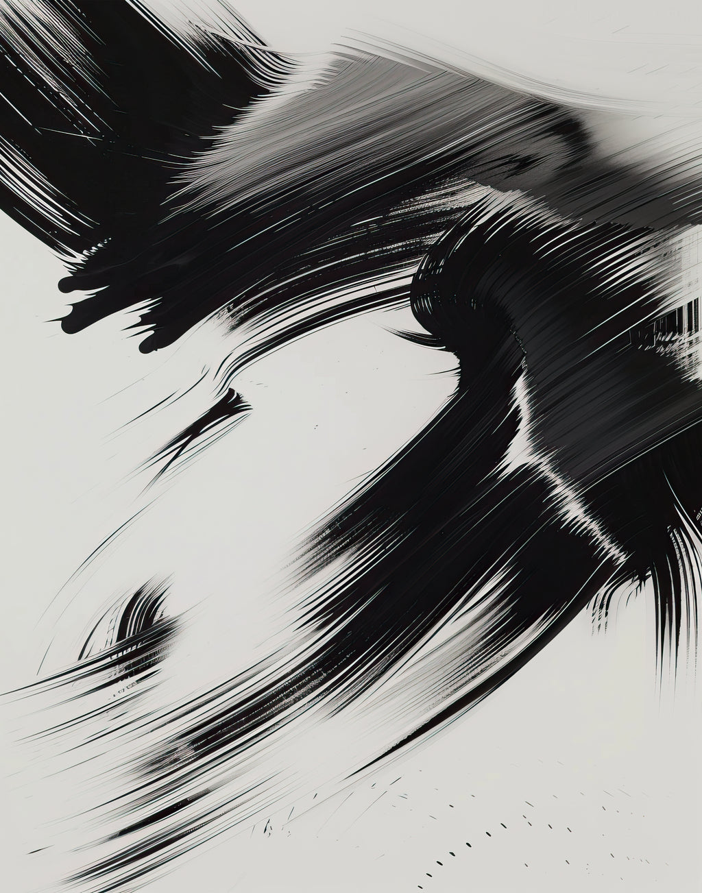 Varreduras negras cruzam o branco em múltiplas direções, como jatos de tinta ao vento. A obra vibra ritmo e velocidade, trazendo presença contemporânea e um toque musical para ambientes minimalistas.
